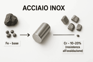 - Cromo (Cr) – 10–20% (garantisce resistenza a ossidazione e corrosione)