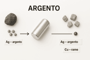 Argento puro Ag 999 oppure in gioielleria Argento 925 (92,5% argento + 7,5% rame, che ne aumenta la resistenza).