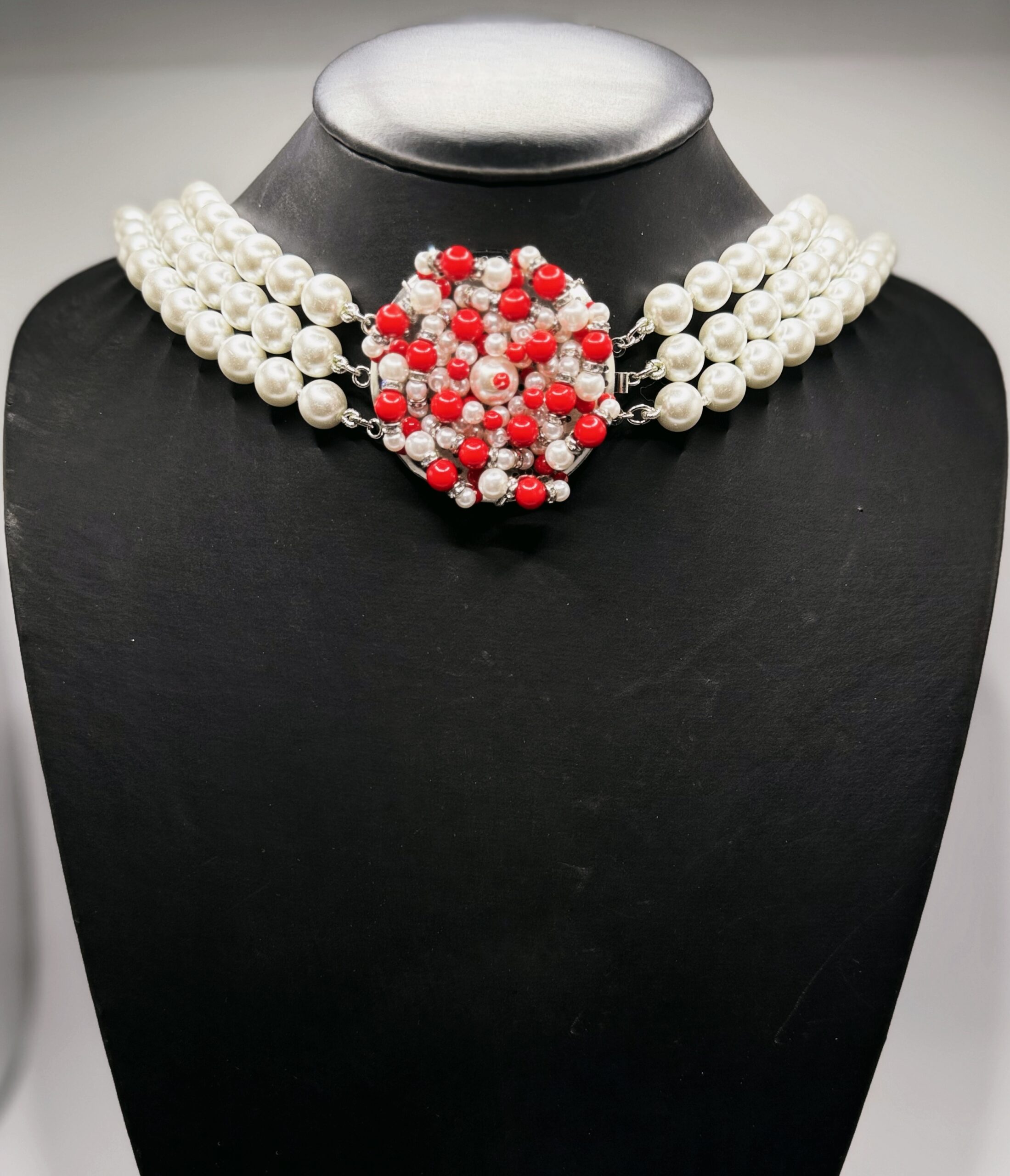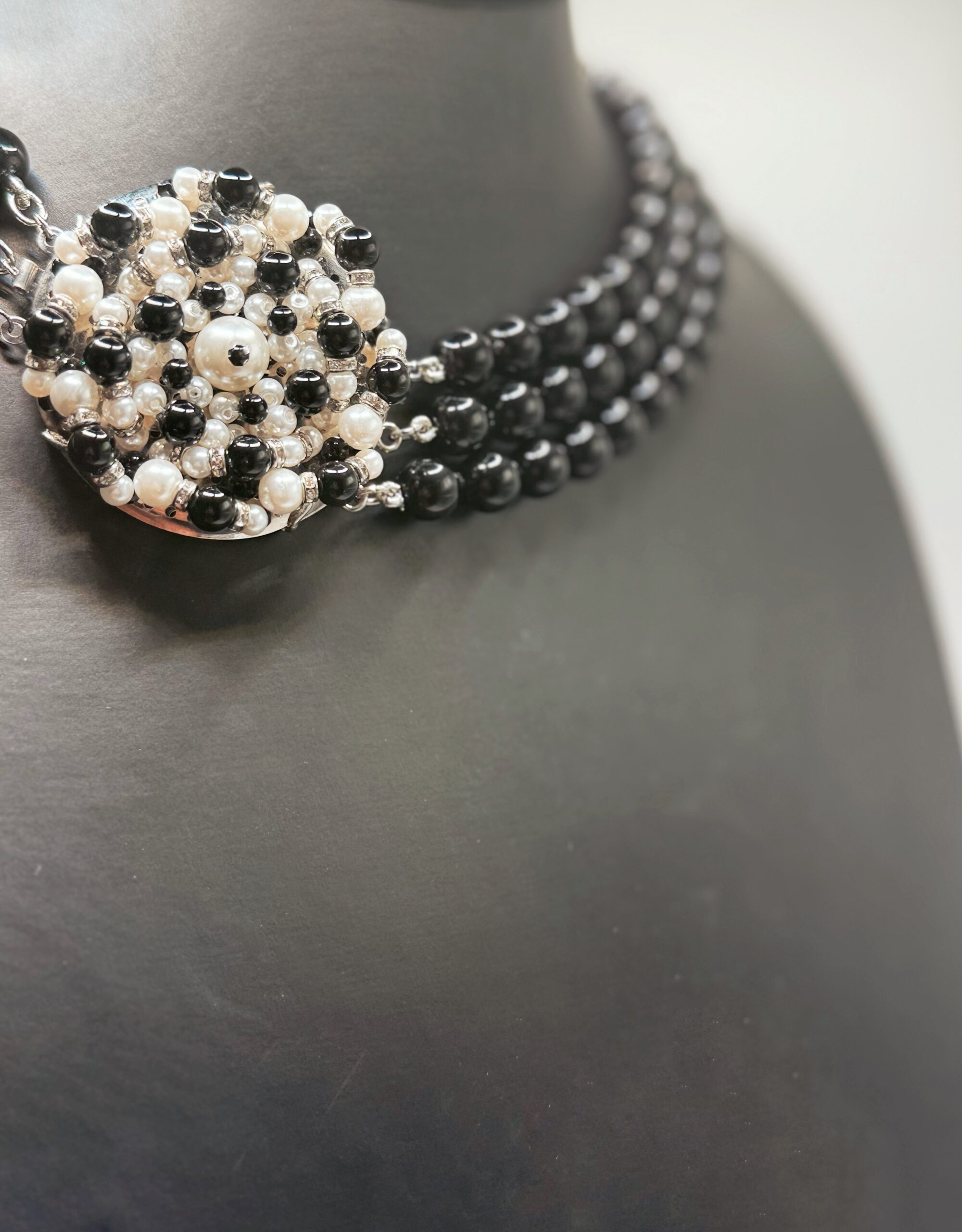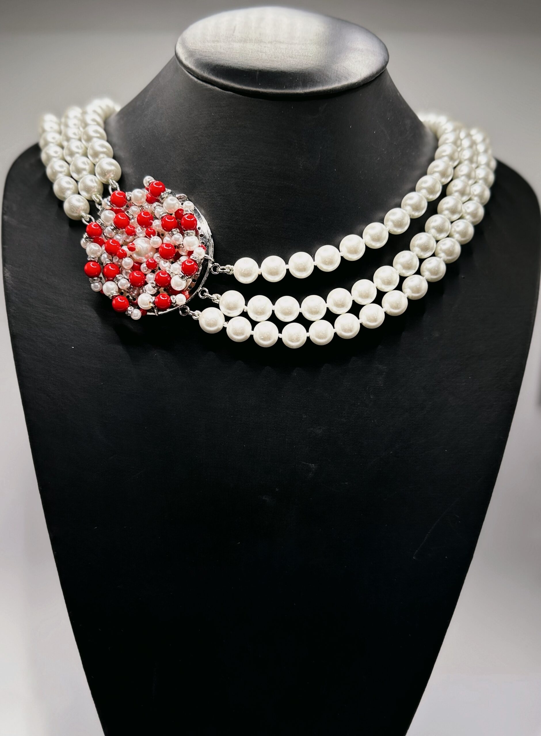 In questa collana di perle multifilo, la chiusura diventa la vera protagonista. Questa collana ribalta il concetto tradizionale: i fili di perle swarovski lucide sono eleganti ma discreti, mentre la chiusura laterale è un vero e proprio gioiello decorativo elaborato con perle bianche, nere o rosse e accenti argentati/cristallo che cattura tutta l’attenzione.