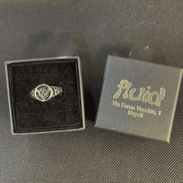 Anello trischele in acciaio con il simbolo celtico delle tre spirali interconnesse. Un gioiello carico di significato spirituale che rappresenta il ciclo eterno della vita e l’armonia universale.
