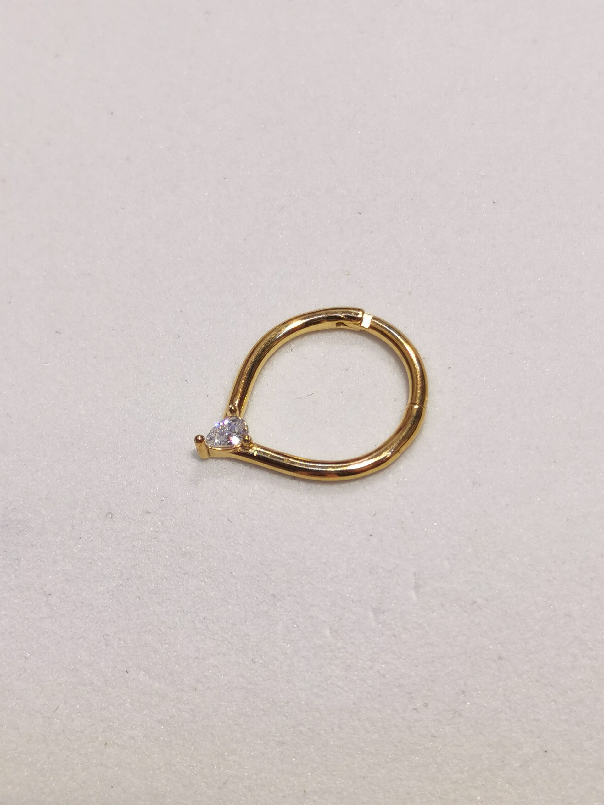 Una goccia di luce pende dal tuo septum con questo elegante design che unisce semplicità e raffinatezza. Il cristallo a goccia crea un effetto lacrima luminosa che danza con ogni tuo movimento, aggiungendo un tocco poetico al tuo look.