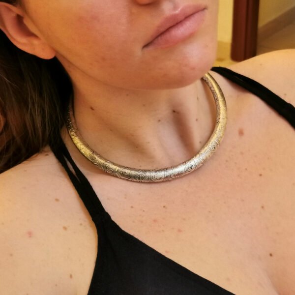 Questo choker presenta pattern etnici che si distinguono per la loro forza espressiva. Le linee e le forme si intrecciano creando un racconto visivo che evoca terre lontane e tradizioni antiche, reinterpretate con sensibilità moderna.