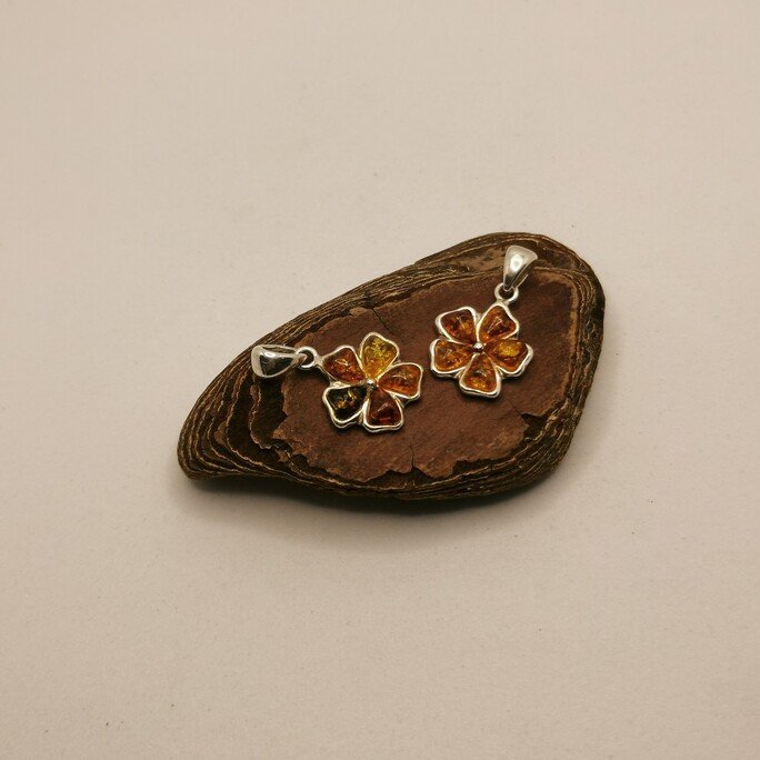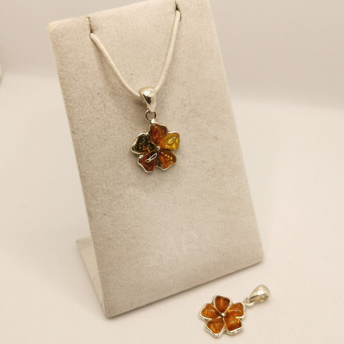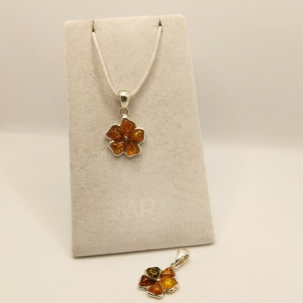 L’Ambra come cuore di un fiore: questo ciondolo presenta la gemma baltica al centro di petali d’argento che si aprono tutto intorno.