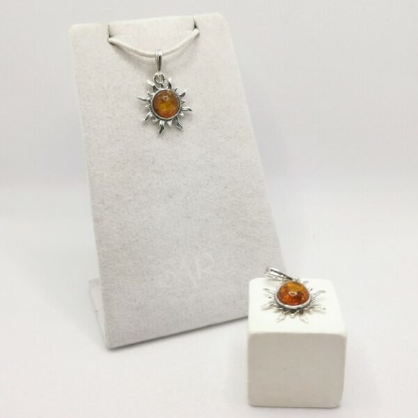 Il sole come gioiello: l’Ambra Baltica al centro di raggi d’argento crea un ciondolo che porta calore e luce ovunque tu vada.