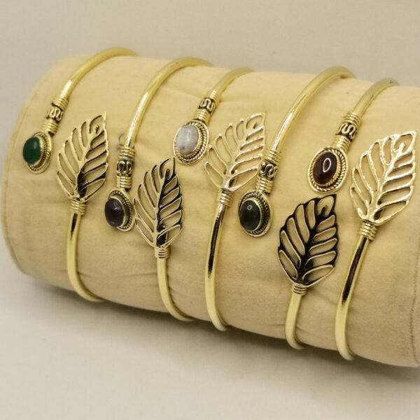 Naturale bracciale in ottone Feather con pietra. Gioiello artigianale in ottone che unisce la leggerezza della piuma alla profondità della gemma.