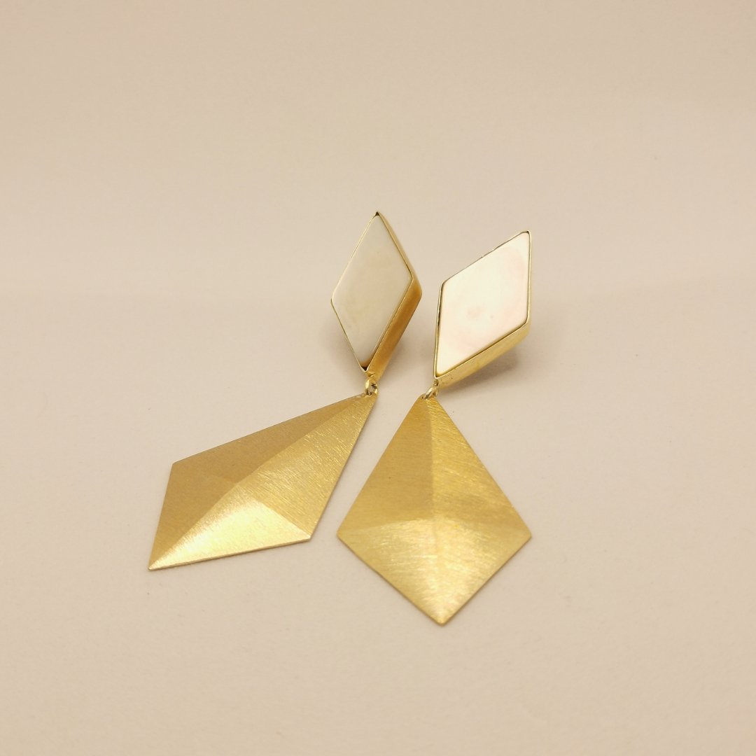 La struttura presenta una composizione modulare a tre elementi romboidali sovrapposti che creano una cascata geometrica dinamica e ipnotica. In alto, due piccoli rombi in agata naturale lucida affiancati introducono il gioiello con un tocco di colore; al centro, un grande rombo in ottone placcato oro 24 carati con finitura satinata opaca domina la composizione; in basso, un rombo finale ancora più importante completa la cascata verticale.