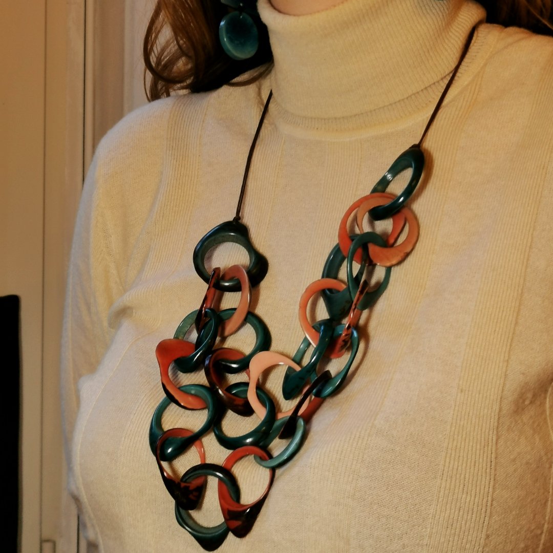 Splendida collana realizzata in avorio vegetale, la pregiata Tagua delle foreste pluviali sudamericane. Un materiale completamente ecologico, alternativa etica all’avorio animale.