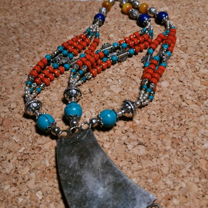 tibet, lega di ottone, collane, corallo bambù, turchese, ambra rossa, pietre naturali, pietre, pietra, stone, stones, brass, necklace, necklaces, coral, handmade, flag