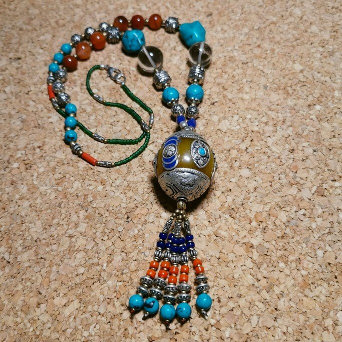 tibet, lega di ottone, collane, corallo bambù, turchese, ambra rossa, pietre naturali, pietre, pietra, stone, stones, brass, necklace, necklaces, coral, handmade, flag