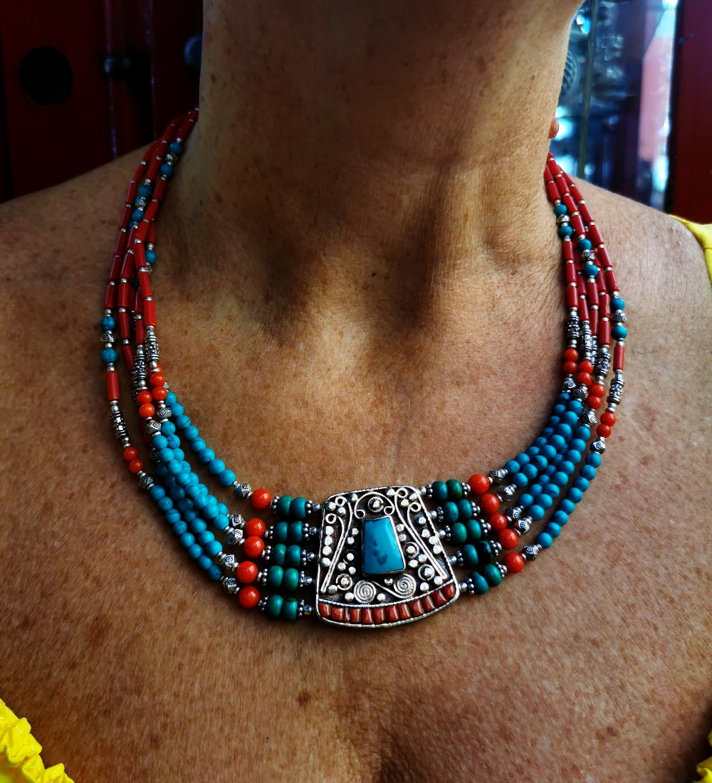Collana artigianale in lega di ottone anallergico con pietra Turchese e pietra blu