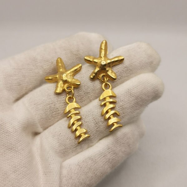 Elegante orecchini a tema mare con lisca di pesce e stella marina in lega di zama, impreziositi da una finitura dorata, con chiusura a farfallina. Ideale per chi ama esprimere la propria personalità attraverso i dettagli.